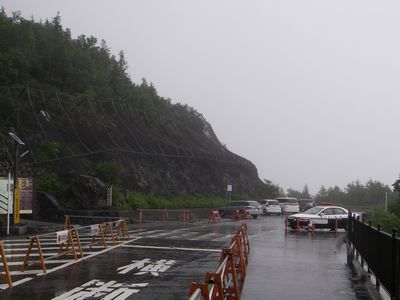 台風が逸れたように風が収まり雨だけになった15:25登山区間はバリケードで封鎖された。