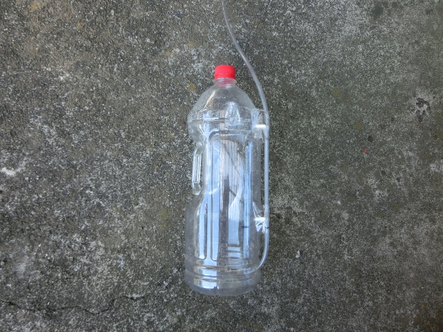 上の容器に水を注ぎ込んで、海抜ゼロ地点で右側のホース部に印をした。高度を増すとホース部の水位は上昇し、1合目で海抜1,000mと、測定時刻とか気温も記録した。富士宮口の旧料金所(現ゲート)を過ぎ、2合目(1,600m)に着く前に、90cm以上も上昇して溢れ出してしまった。このことからも何より精密な人体は、その影響を受け易いはずである。