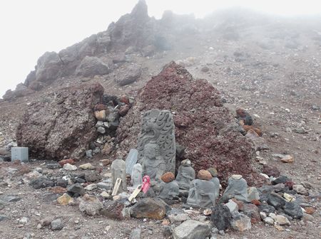 富士山頂の公衆トイレ手前右手に首なし地蔵が何体も置かれている。